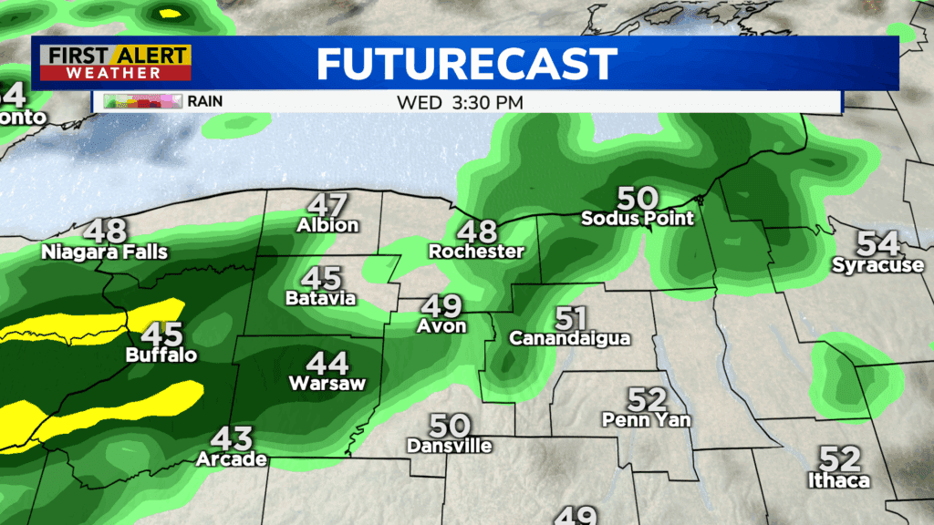 ROCHESTER, N.Y. – Fall is in the air, and in the weather! An large upper level low moving in Tuesday night will park itself over us for much of the rest of this week. This will keep us cooler than average, breezy and unsettled with frequent lake effect rain showers. Breaking down the details: rain showers will pick up a bit after midnight, meaning a damp start in some spots Wednesday morning. While Wednesday won’t be a washout, we’ll have some off and on waves of lake rain showers. These showers will tend to be most persistent off of Lake Erie, which means areas west and south of Rochester. It’ll be cool, with highs in the lower 50s and a noticeable breeze out of the southwest, gusting to 30 mph at times.