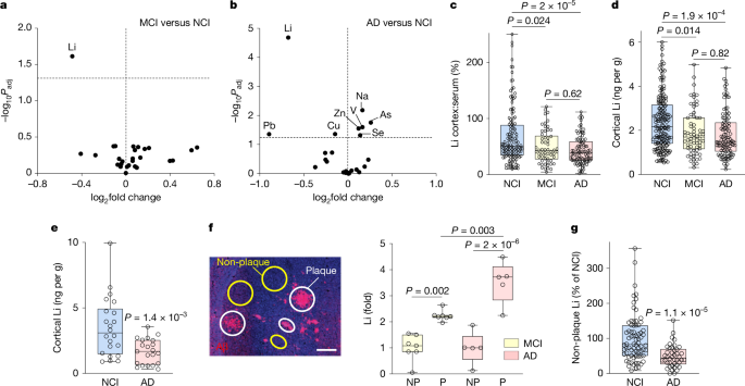 The frozen cortical and cerebellum samples were first allowed to thaw, and were then weighed and digested in 5 volumes of nitric acid 67% (w/m, relative to wet mass; BDH Aristar Ultra, VWR, 87003-226) for 72 h with regular vortexing (20 s per vial every 12 h). The samples were fully digested after about 36 h. The serum, the brain non-plaque fractions and the aqueous solutions were digested in an equal volume of nitric acid (67%) for 48 h with regular vortexing (20 s per vial every 12 h). After digestion with nitric acid, hydrogen peroxide (30%; BDH Aristar Ultra, VWR, 87003-224) was added for 24 h with regular vortexing (20 s per vial every 12 h). We added one volume of hydrogen peroxide (w/m, relative to starting wet mass) to digested brain tissues and 0.75 volumes (relative to starting sample volume) to digested serum, non-plaque fractions and aqueous solutions. The samples were then diluted using a 2% nitric solution in ultrapure water (BDH Aristar, VWR, 87003-236). Indium was added to each solution as an internal standard (50 parts per billion; ppb). For all ICP–MS runs, we also measured freshly made solutions of element standards (0, 10 ppt, 50 ppt, 100 ppt, 1 ppb, 10 ppb and 50 ppb) using a 30-element ICP standard (Aristar, VWR, 89800-580). Each run included n = 10 digestion blanks as well as n = 20–30 blank measurements to calculate the detection limits. The samples were injected into a PerkinElmer NexION 2000C ICP–MS instrument fitted with a cross-flow nebulizer and peristaltic pump for sample introduction. The sample delay time was 30 s with a pump speed of 24 rpm. A wash solution of 2% nitric was used between analyses of samples. The human cortex, cerebellum and serum samples were each measured twice on two consecutive days (two technical replicates per sample) and the average value was obtained for each sample. The correlation coefficients between the lithium concentrations measured on day 1 and day 2 were r > 0.99 for frontal cortex, cerebellum and serum, showing that the ICP–MS measurement was highly reproducible. After each run, ICP–MS signal processing was done using GeoPro 2010 Software (Cetac Technologies). We derived the standard curves for each element, calculated the concentration of each element in the diluted solution, and used the dilution factors to derive elemental abundance in the original samples. Li levels in the cortex and cerebellum are reported per unit of wet weight (Fig. 1d,e, Extended Data Fig. 1b and Supplementary Table 1). Limits of detection (LODs) and limits of quantification (LOQs) were calculated as follows: LOD = YB + 2tSB and LOQ = YB + 10SB, where YB is the average blank signal, t is the critical value of the one-tailed t-test (one-tailed, 95% confidence interval; for example, for 27 blank samples, df = 26 and t = 1.706) and SB is the standard deviation of a blank signal. LOD and LOQ values for all metals can be found in Supplementary Table 1. All individual Li measurements in human samples (prefrontal cortex, cerebellum and serum) were above the LOQ. In recovery experiments, wet brain samples or fluids were spiked with lithium standard added at three levels (n = 7 replicates per spiking level). The recovery of Li from spiked samples ranged from 91% to 105%. All human sample measurements were double-blinded: one lab member not involved in the study relabelled the samples and kept a file with the old and new codes. After the ICP–MS measurements, the samples were unblinded in the presence of the researchers involved in the study, as well as the lab member who was not involved in the study.