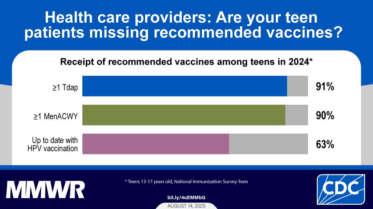 A strong provider recommendation is associated with increased likelihood of being vaccinated (5); however, in this analysis, adolescents living in mostly rural areas were less likely to receive an HPV vaccination recommendation from a provider than were those living in mostly urban areas. In 2024, ≥1-dose HPV coverage and the percentage of adolescents up to date with HPV vaccination were consistently higher among those who received a provider recommendation for vaccination. These findings highlight the influence of provider recommendations and the potential for strong provider recommendations to improve vaccination coverage. Ongoing conversations with families can emphasize the role of the HPV vaccine in cancer prevention and the importance of other vaccines recommended for adolescents.