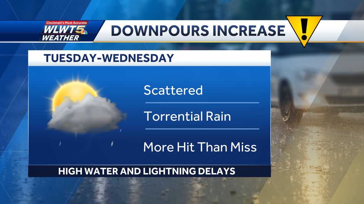 The last few days, most towns stayed dry as we only saw some isolated pop ups. For the next two days that forecast flips and we are more likely to get hit with a shower or storm than not.Tuesday and Wednesday are WLWT Weather Impact Days. While it won’t be a complete washout any day, you can expect more widespread coverage of scattered storms in our area impacting outdoor games/practices and plans each day. Any spot that gets a heavy downpour that lasts an hour or so could see locally high water.We dry back out this weekend but it remains hot! Highs flirt with 90 or higher Saturday and Sunday. It will likely feel like the mid-to-upper-90s, so make plans to hit the pool!